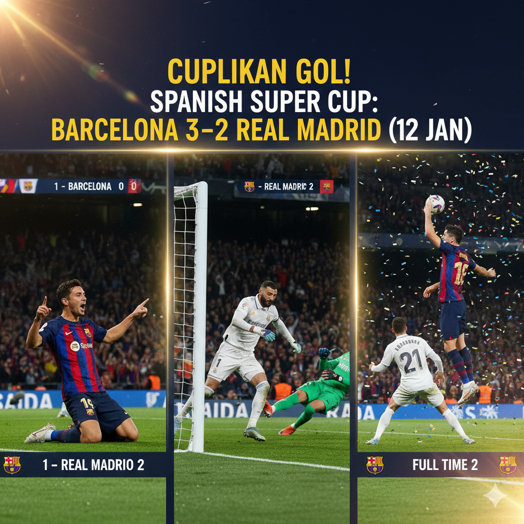 Cuplikan gol Barcelona vs Real Madrid pada 12 Januari 2026 menghadirkan El Clasico yang spektakuler dan dramatis. Barcelona keluar sebagai pemenang dengan skor 3-2 dalam pertandingan yang penuh gol dan intensitas tinggi. Lima gol, drama hingga menit akhir, dan performa luar biasa dari kedua tim menjadikan pertandingan ini sebagai salah satu El Clasico paling memorable di Spanish Super Cup.