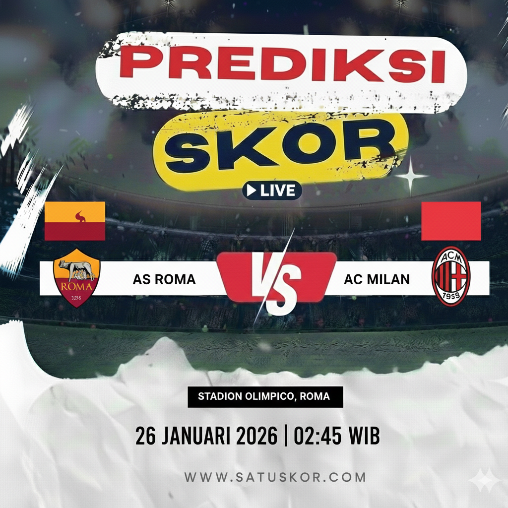 Satuskor.com – Prediksi pertandingan besar akan tersaji pada Senin, 26 Januari 2026, saat AS Roma vs AC Milan dalam lanjutan kompetisi Serie A 2025/2026. Laga ini akan berlangsung di Stadion Olimpico pada pukul 02:45 WIB dan disiarkan melalui beIN Sports serta platform streaming Vidio.