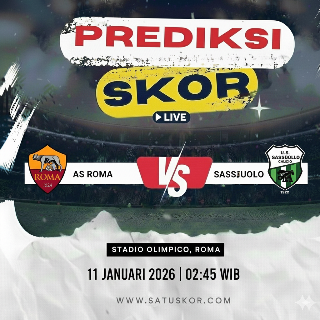 Satuskor.com – Prediksi pertandingan menarik akan tersaji pada Minggu, 11 Januari 2026, ketika AS Roma vs Sassuolo dalam lanjutan Serie A 2025/2026. Laga akan berlangsung di Stadio Olimpico pada pukul 02:45 WIB dan disiarkan melalui beIN Sports serta platform streaming resmi Vidio.