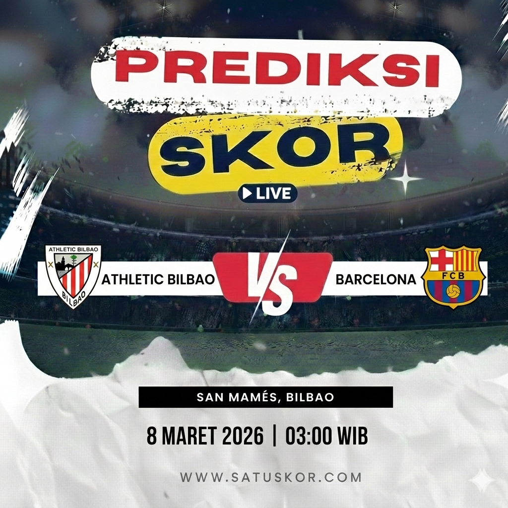 Satuskor.com – Prediksi laga besar akan tersaji pada Minggu, 8 Maret 2026, ketika Athletic Bilbao vs Barcelona dalam lanjutan La Liga 2025/2026. Pertandingan akan berlangsung di San Mamés pada pukul 03:00 WIB dan diprediksi menjadi salah satu duel paling panas pekan ini.