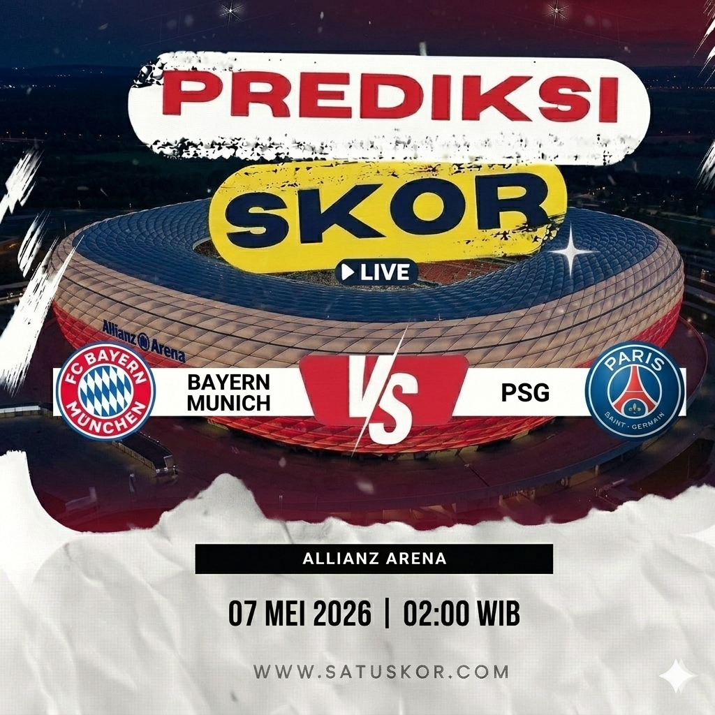 Satuskor.com – Prediksi pertandingan panas akan tersaji pada Kamis, 7 Mei 2026, saat Bayern Munich vs PSG dalam laga semifinal kompetisi Eropa 2025/2026. Duel ini akan berlangsung di Allianz Arena pada pukul 02:00 WIB dan disiarkan melalui beIN Sports serta platform streaming Vidio.