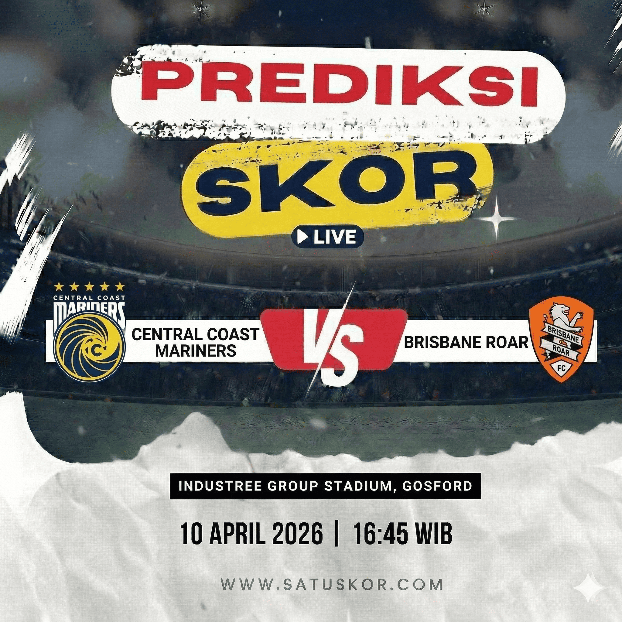 Satuskor.com – Prediksi pertandingan menarik akan tersaji pada Jumat, 10 April 2026, ketika Central Coast Mariners vs Brisbane Roar dalam lanjutan kompetisi A-League 2025/2026. Laga ini akan berlangsung di Industree Group Stadium pada pukul 16:45 WIB dan dapat disaksikan melalui layanan streaming resmi A-League.