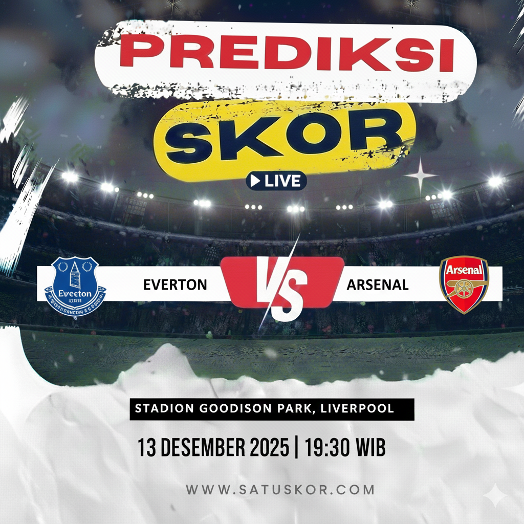 Satuskor.com – Prediksi pertandingan menarik akan tersaji pada Sabtu, 13 Desember 2025, ketika Everton vs Arsenal dalam lanjutan Premier League 2025/2026. Laga ini akan digelar di Goodison Park pada pukul 19:30 WIB dan disiarkan melalui platform resmi Premier League serta layanan streaming berlisensi di Indonesia.