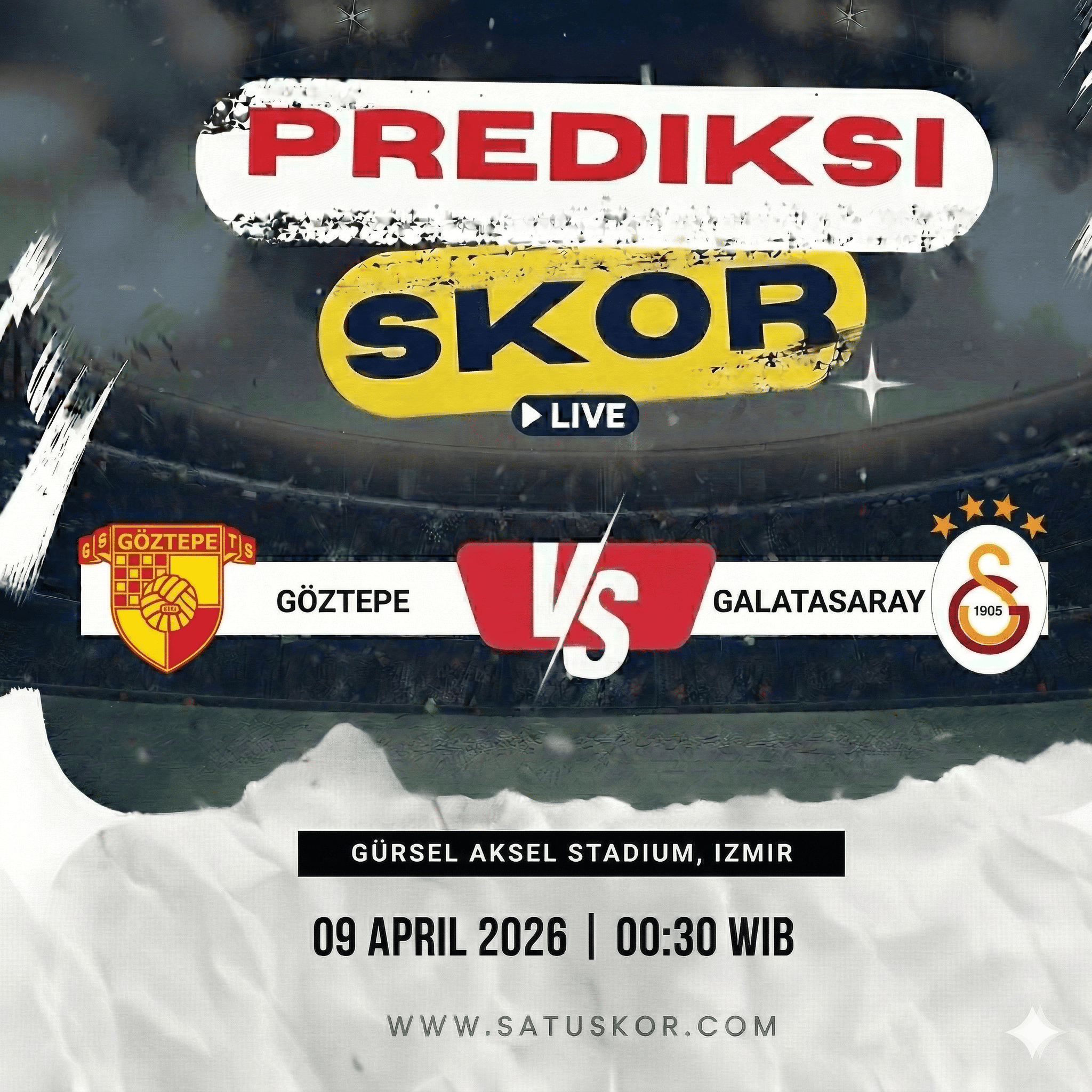 Satuskor.com – Prediksi pertandingan menarik akan tersaji pada Kamis, 9 April 2026, saat Goztepe vs Galatasaray dalam lanjutan kompetisi Süper Lig 2025/2026. Laga ini akan berlangsung di Gürsel Aksel Stadium pada pukul 00:30 WIB dan dapat disaksikan melalui platform streaming resmi liga.
