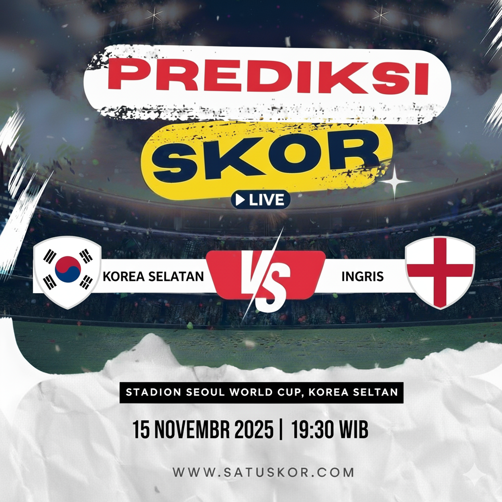 Satuskor.com – Prediksi duel menarik akan tersaji pada Sabtu, 15 November 2025, ketika Tim Nasional Korea Selatan vs Tim Nasional Inggris dalam laga persahabatan internasional FIFA Matchday. Pertandingan ini akan digelar di Seoul World Cup Stadium, Korea Selatan, dengan kick-off pukul 18:00 WIB, dan disiarkan langsung melalui SPOTV serta platform streaming Vidio dan FIFA+.