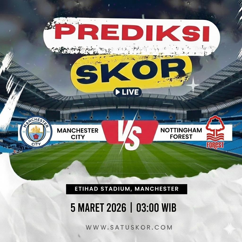 Satuskor.com – Prediksi laga seru akan tersaji pada Kamis, 5 Maret 2026, ketika Manchester City vs Nottingham Forest dalam lanjutan Premier League 2025/2026. Pertandingan akan berlangsung di Etihad Stadium pada pukul 03:00 WIB dan disiarkan melalui SCTV serta platform streaming Vidio.