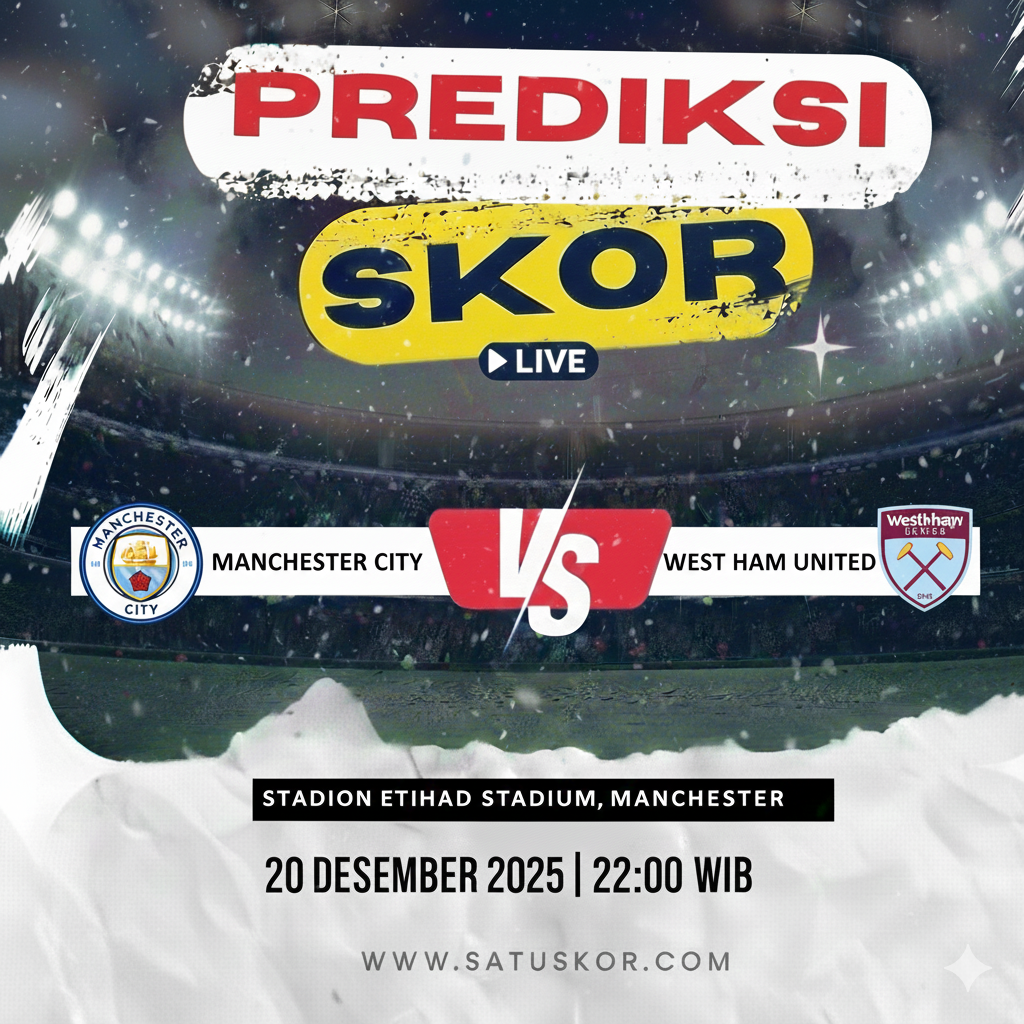 Satuskor.com – Prediksi pertandingan seru akan tersaji pada Sabtu, 20 Desember 2025, ketika Manchester City vs West Ham United dalam lanjutan Premier League 2025/2026. Laga ini akan digelar di Etihad Stadium pada pukul 22:00 WIB dan disiarkan melalui platform resmi Premier League serta layanan streaming berlisensi.