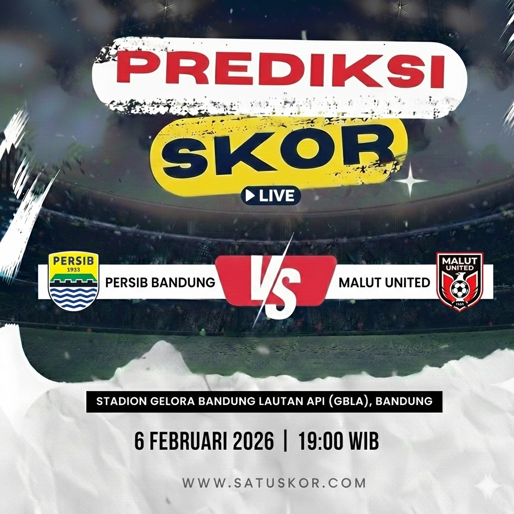Satuskor.com – Prediksi pertandingan menarik akan tersaji pada Jumat, 6 Februari 2026, saat Persib Bandung vs Malut United dalam lanjutan Liga 1 Indonesia 2025/2026. Laga ini dijadwalkan berlangsung di Stadion Gelora Bandung Lautan Api (GBLA) pada pukul 19.00 WIB dan dapat disaksikan melalui siaran langsung Indosiar serta live streaming Vidio.