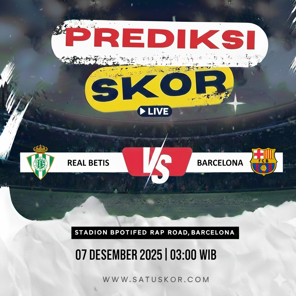 Satuskor.com – Prediksi duel panas akan tersaji pada Minggu, 7 Desember 2025, ketika Real Betis vs Barcelona dalam lanjutan La Liga 2025/2026. Pertandingan digelar di Estadio Benito Villamarín pada pukul 03:00 WIB dan disiarkan melalui beIN Sports serta layanan streaming resmi.