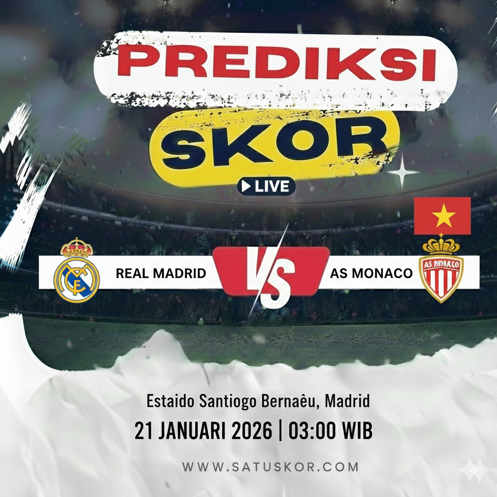 Satuskor.com – Prediksi pertandingan big match akan tersaji pada Rabu, 21 Januari 2026, ketika Real Madrid vs AS Monaco dalam lanjutan kompetisi Eropa musim 2025/2026. Laga ini akan berlangsung di Santiago Bernabéu pada pukul 03:00 WIB dan disiarkan melalui platform siaran resmi UEFA serta layanan streaming berlisensi.