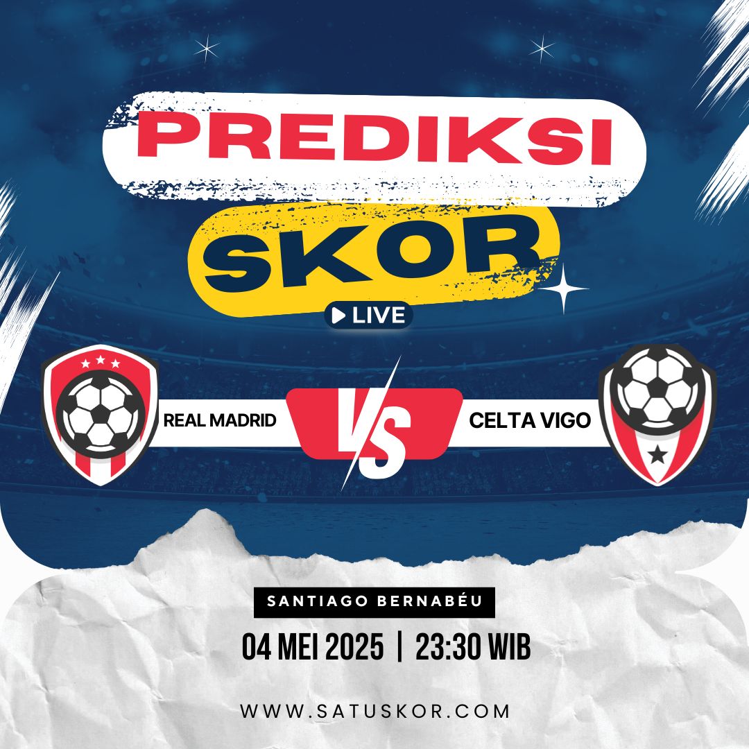 Satuskor.com – Prediksi pertandingan seru antara Real Madrid vs Celta Vigo akan digelar pada Minggu, 4 Mei 2025 di Santiago Bernabéu, Madrid. Laga ini akan dimulai pada pukul 23:30 WIB dan disiarkan langsung melalui beIN Sports, serta dapat disaksikan lewat layanan streaming Vidio dan DAZN untuk pengguna berlangganan.