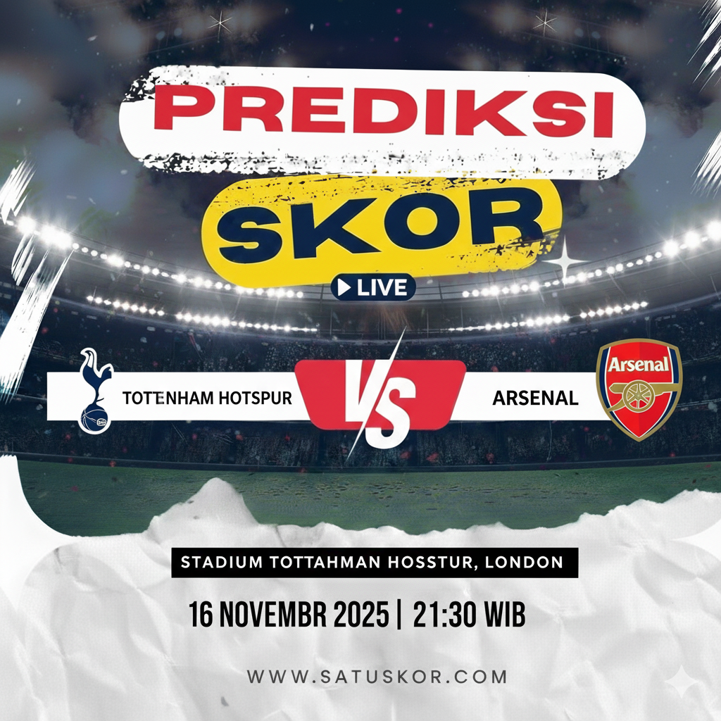 Satuskor.com – Prediksi duel panas akan tersaji di Premier League saat Tottenham Hotspur vs Arsenal pada Minggu, 16 November 2025, di Tottenham Hotspur Stadium, London. Pertandingan bertajuk North London Derby ini akan dimulai pukul 23:30 WIB dan disiarkan langsung melalui RCTI, Vidio, serta beIN Sports bagi pengguna berlangganan.