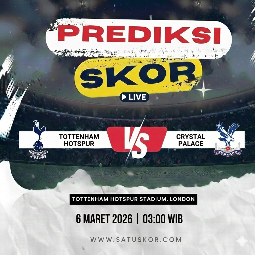 Satuskor.com – Prediksi pertandingan menarik akan tersaji pada Jum’at, 6 Maret 2026, ketika Tottenham Hotspur vs Crystal Palace dalam lanjutan Premier League 2025/2026. Duel Derby London ini akan digelar di Tottenham Hotspur Stadium pada pukul 03:00 WIB dan disiarkan melalui platform resmi pemegang hak siar Liga Inggris di Indonesia.
