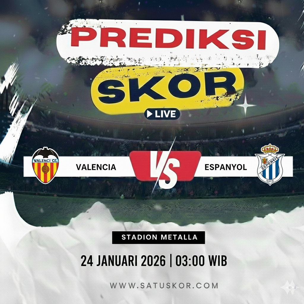 Satuskor.com – Prediksi pertandingan menarik akan tersaji pada Sabtu, 24 Januari 2026, saat Valencia vs Espanyol dalam lanjutan kompetisi La Liga Spanyol 2025/2026. Laga ini akan berlangsung di Stadion Mestalla pada pukul 03:00 WIB dan disiarkan melalui beIN Sports serta platform streaming resmi Vidio.